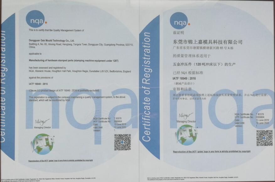 自2018年始,公司開始導(dǎo)入IATF16949體系運(yùn)作,經(jīng)過長(zhǎng)達(dá)1年多的內(nèi)部梳理及整改,于2019年6月份,正式通過IATF16949的認(rèn)證,領(lǐng)得認(rèn)證證書